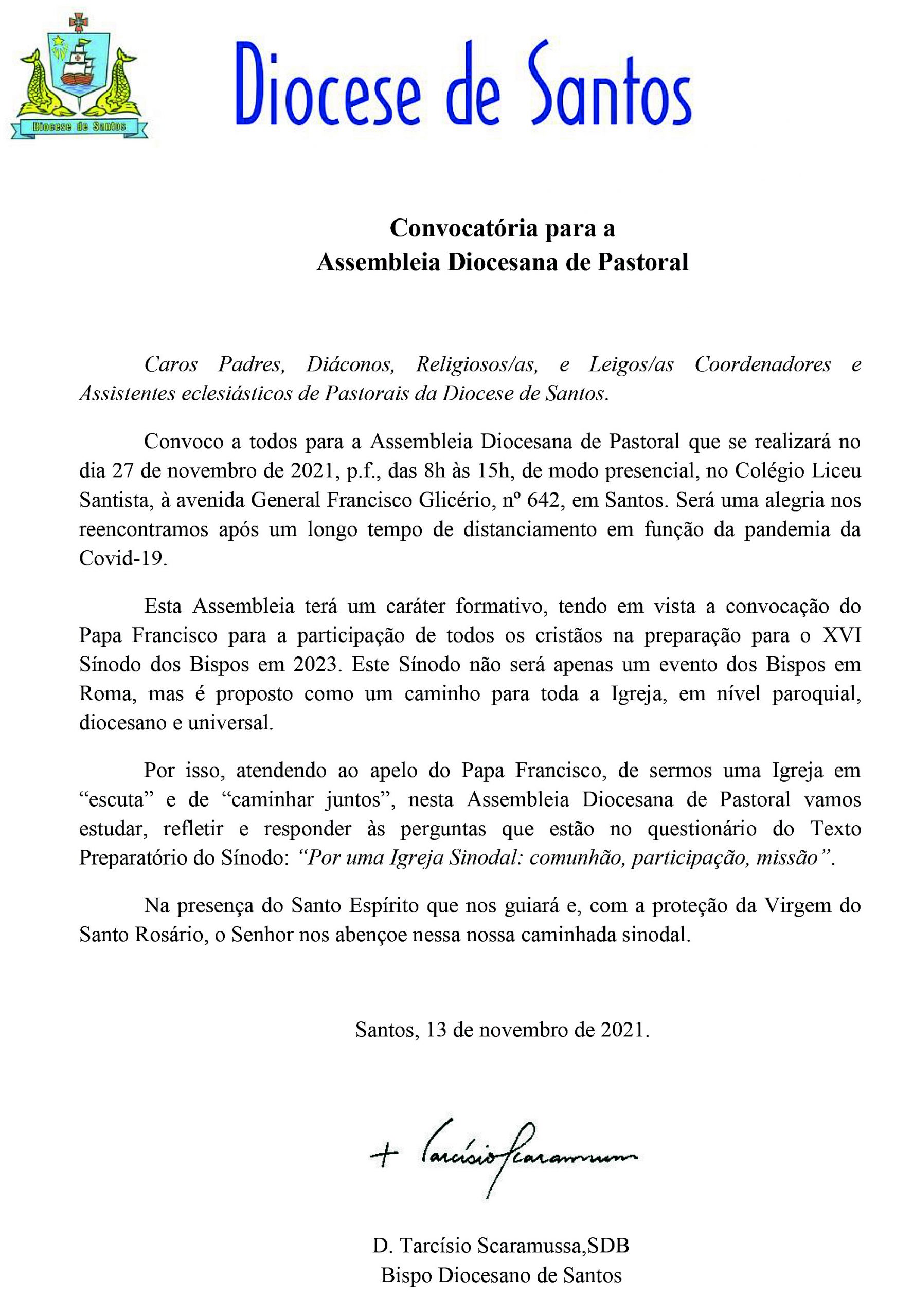 Convoco a todos para a Assembleia Diocesana de Pastoral que se realizará no dia 27 de novembro de 2021, p.f., das 8h às 15h, de modo presencial, no Colégio Liceu Santista, à avenida General Francisco Glicério, nº 642, em Santos. Será uma alegria nos reencontramos após um longo tempo de distanciamento em função da pandemia da Covid-19.