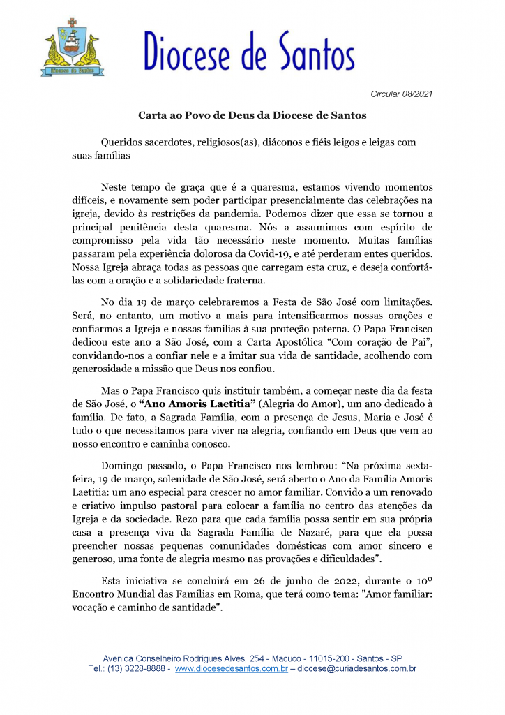 Carta ao Povo de Deus da Diocese de Santos – Dom Tarcísio Scaramussa, SDB