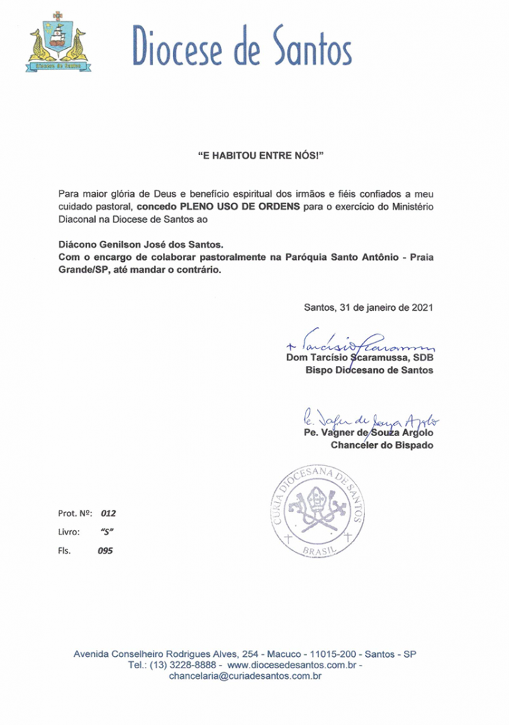 Concede Pleno Uso de Ordens – Diácono Genilson José dos Santos (31/01/2021)