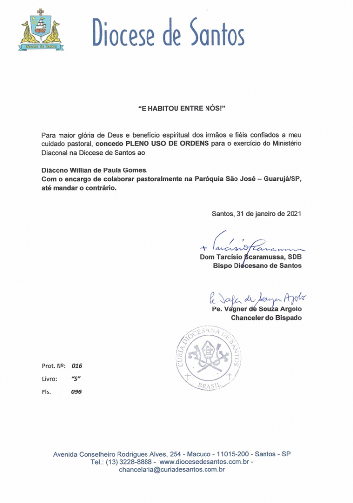 Concede Pleno Uso de Ordens – Diácono Willian de Paula Gomes (31/01/2021)