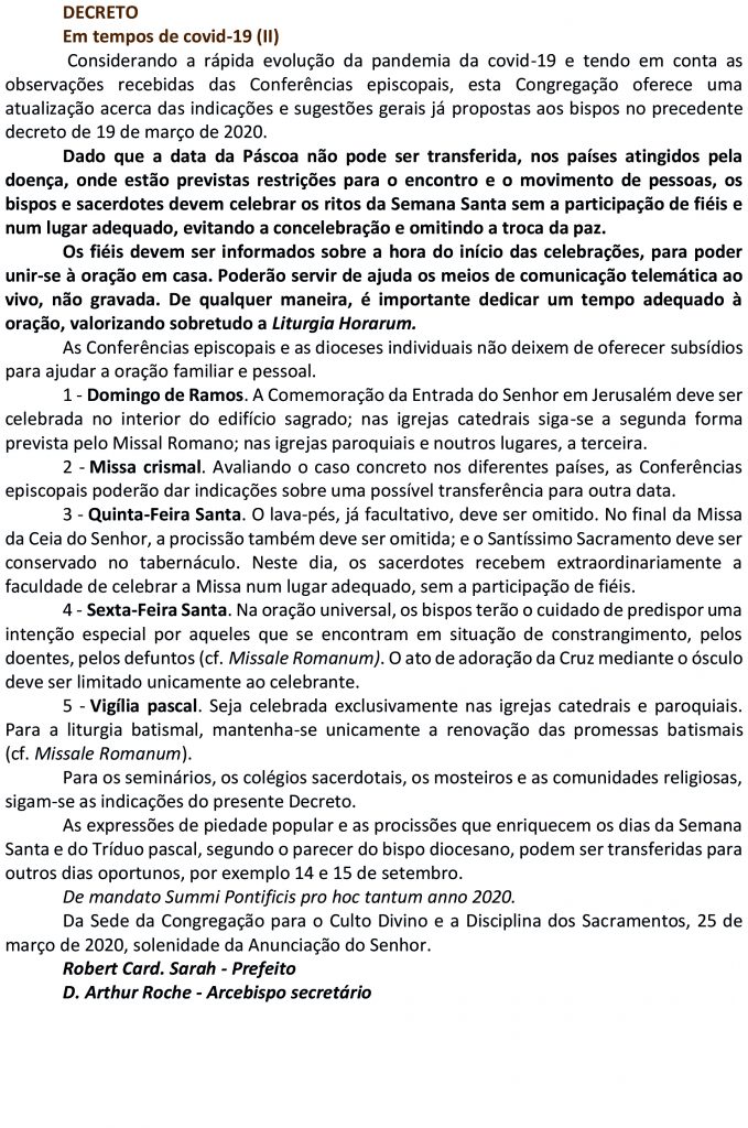 DECRETO Em tempos de covid-19 (II) – Da Sede da Congregação para o Culto Divino e a Disciplina dos Sacramentos, 25 de março de 2020, solenidade da Anunciação do Senhor (Robert Card. Sarah/Prefeito; D. Arthur Roche/Arcebispo secretário)