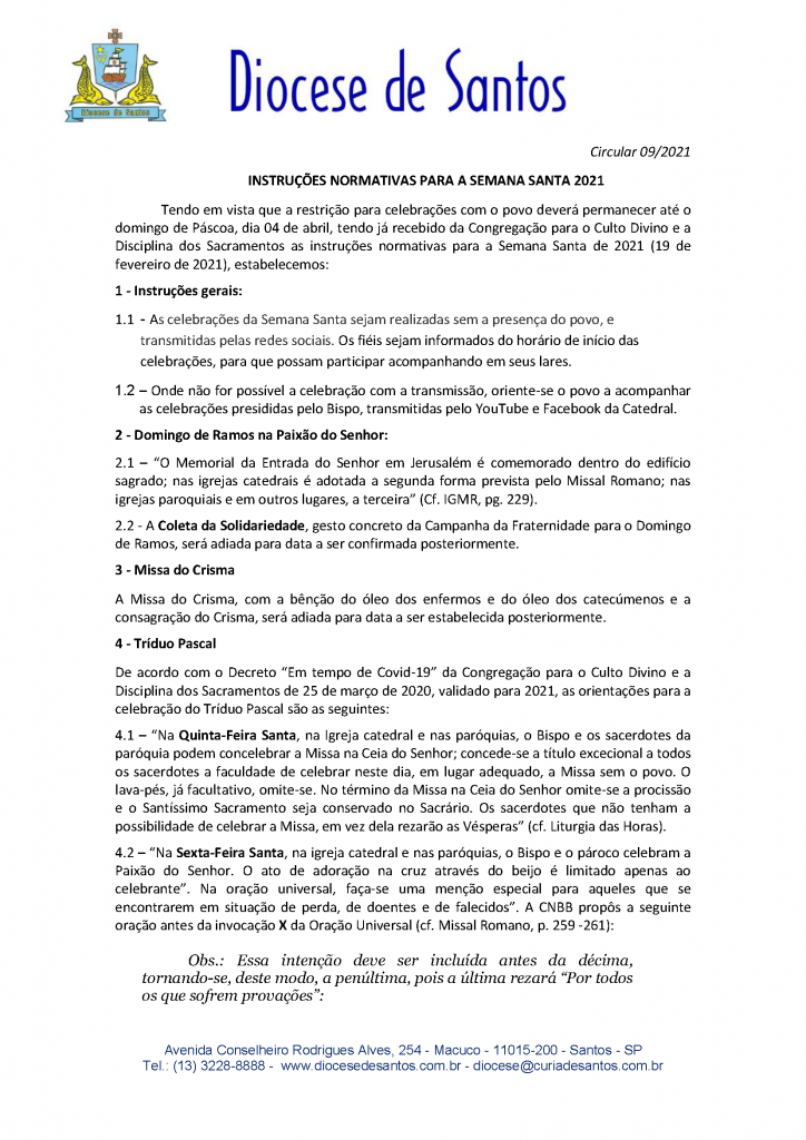 Instruções Normativas para a Semana Santa 2021 – Circ. 09/2021