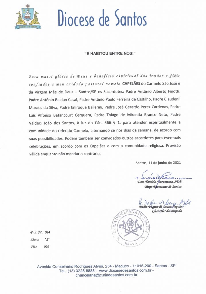 Nomeia – Capelães do Carmelo São José e da Virgem Mãe de Deus- 11/06/2021