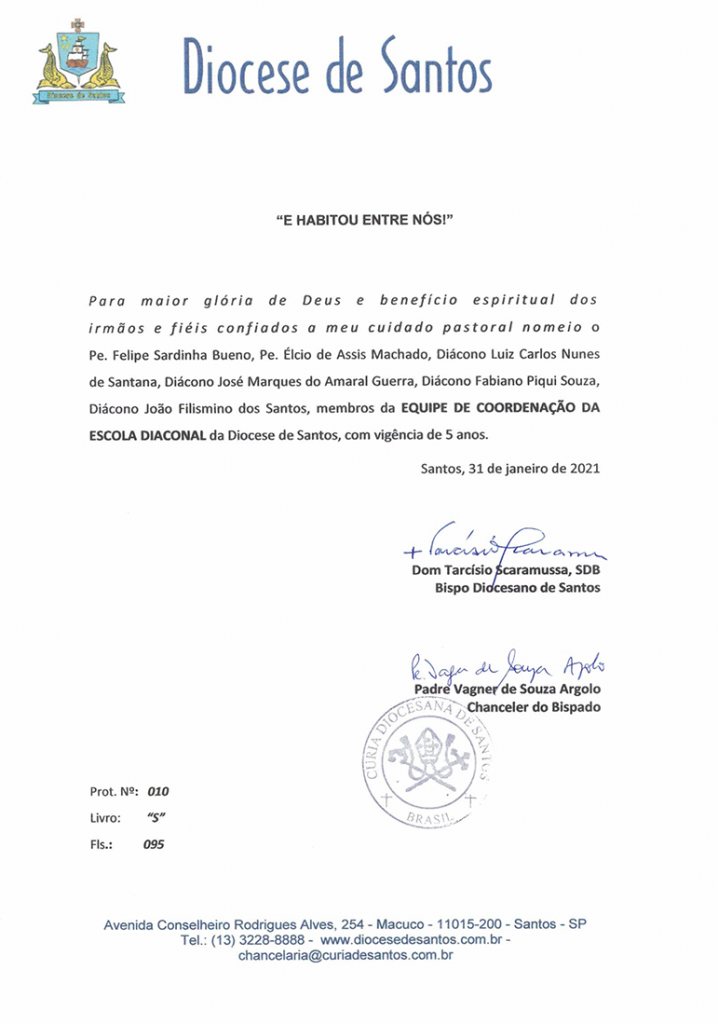 Arquivo Diocesano – Certidões e Documentos / Vigário Geral / Vigário Episcopal para a Ação Social da Evangelização / Chanceler do Bispado / Ecônomo / Vigário Judicial / Coordenador Diocesano de Pastoral