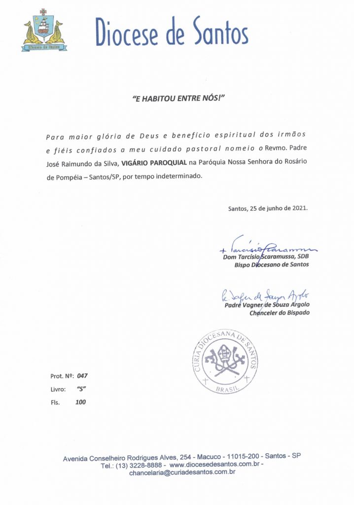 Nomeia – Padre José Raimundo da Silva – Vigário Paroquial na Par. N. Sra. do Rosário de Pompéia – Santos – SP - 25/06/2021