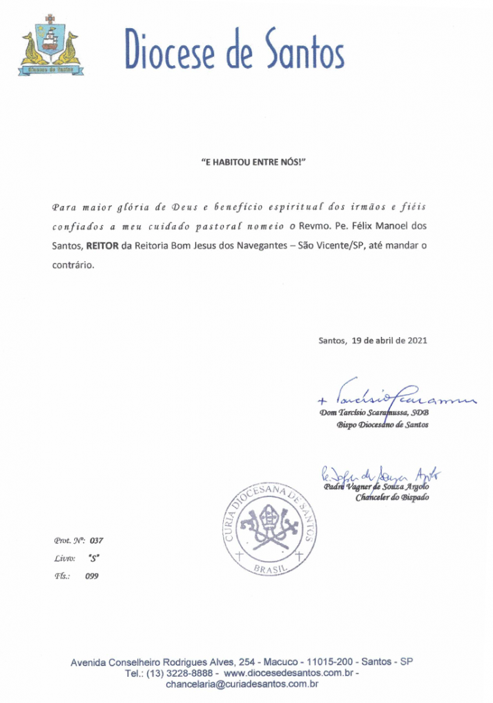 Nomeia – Pe. Félix Manoel dos Santos – Reitor da Reitoria Bom Jesus dos Navegantes – S. Vicente – SP – 19/04/2021