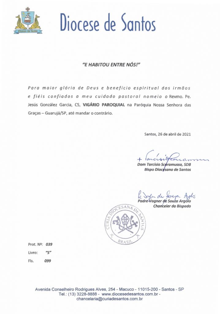 Nomeia – Pe. Jesús González Garcia, CS, Vigário Paroquial na Par. N. Sra. das Graças – Guarujá/SP – 26/4/2021