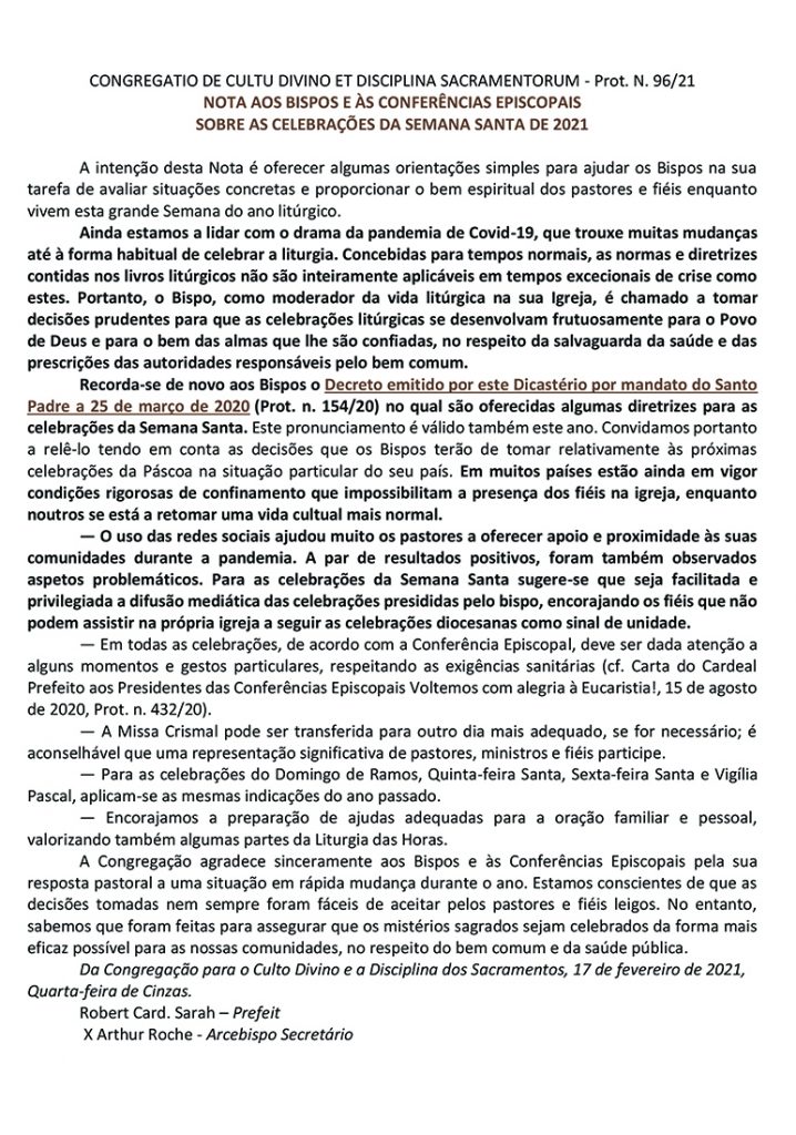 CONGREGATIO DE CULTU DIVINO ET DISCIPLINA SACRAMENTORUM – Prot. N. 96/21 – NOTA AOS BISPOS E ÀS CONFERÊNCIAS EPISCOPAIS SOBRE AS CELEBRAÇÕES DA SEMANA SANTA DE 2021.