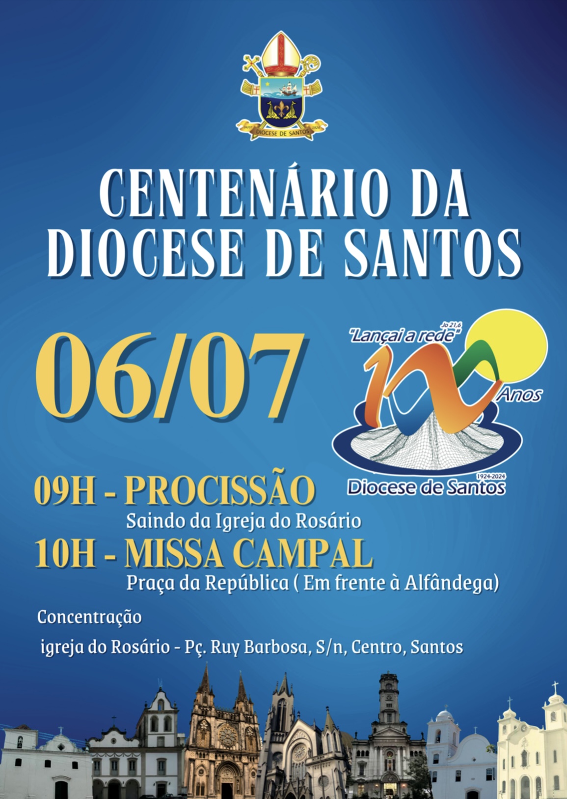 No dia 06 de julho concluiremos o ano centenário de criação da Diocese de Santos, com a missa festiva na Catedral e o fechamento da Porta Santa. A celebração será o coroamento do jubileu, e ação de graças a Deus que nos concedeu a alegria de viver este tempo.