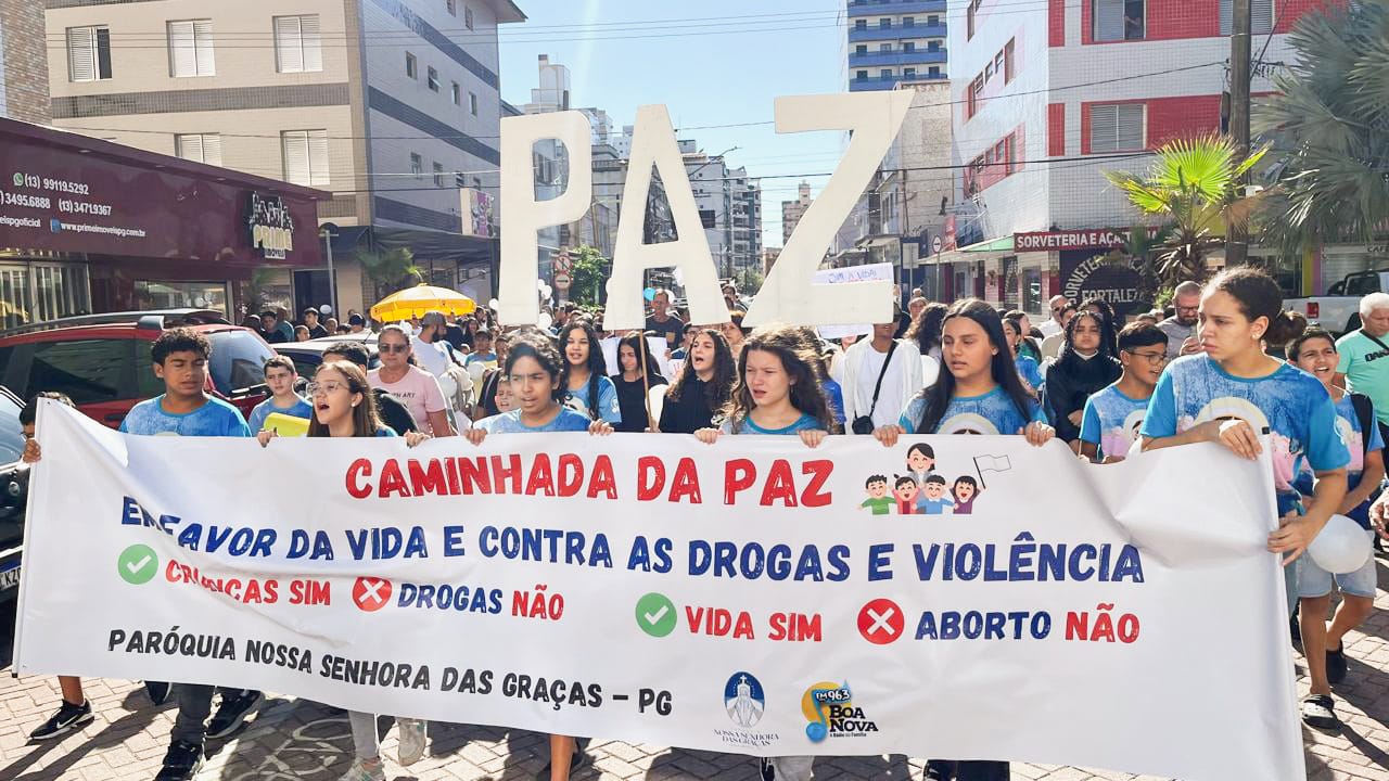 Jovens, crianças da catequese, fiéis da Paróquia Nossa Senhora das Graças e crianças da escolas de Praia Grande participaram da Caminhada pela Paz, com o tema "Crianças Sim, Drogas Não".